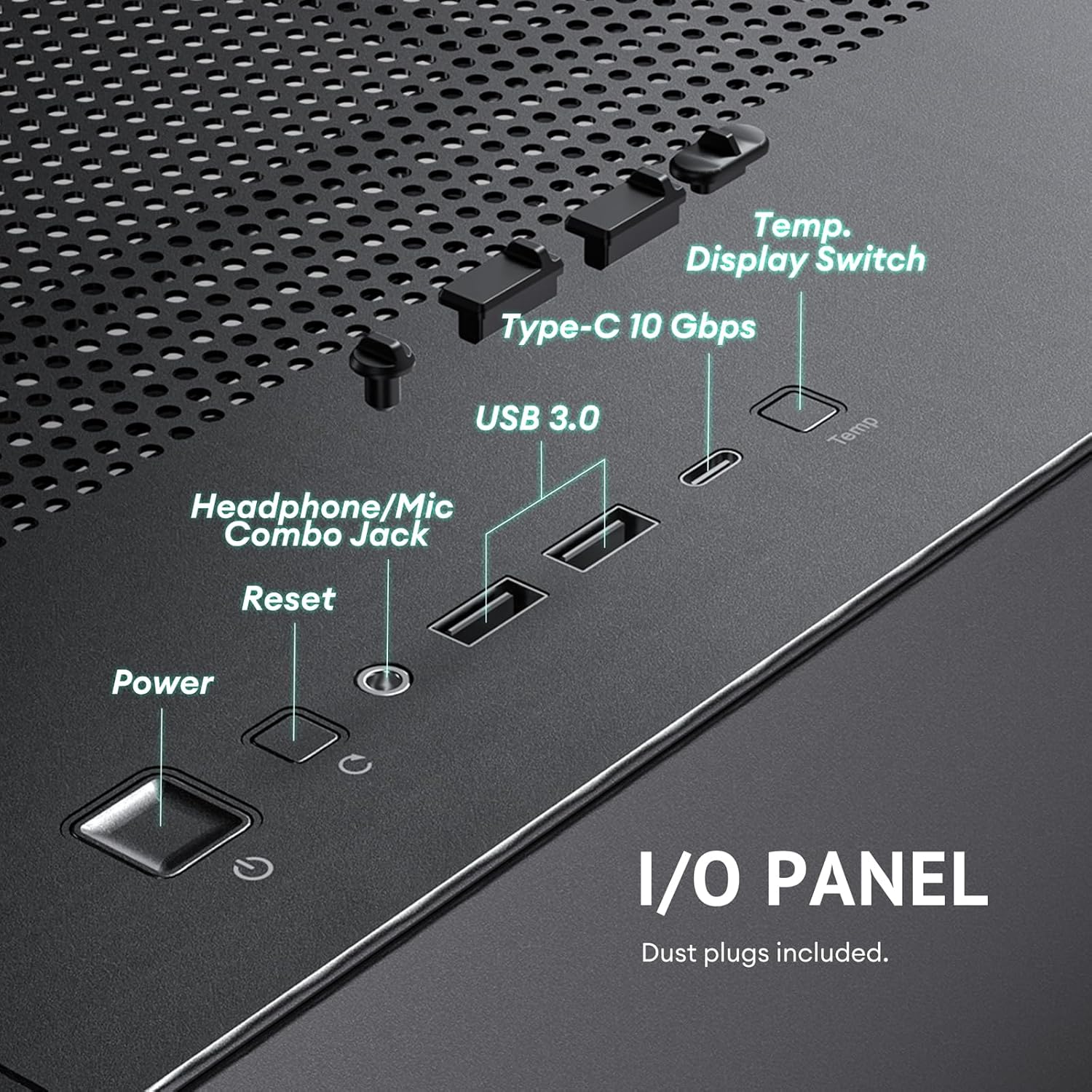 - Front Access & Controls: Power, Reset, USB 3.0 x 2, Type-C 10Gbps x 1, Headphone/Mic Combo Jack, Temp. Display Switch x 1