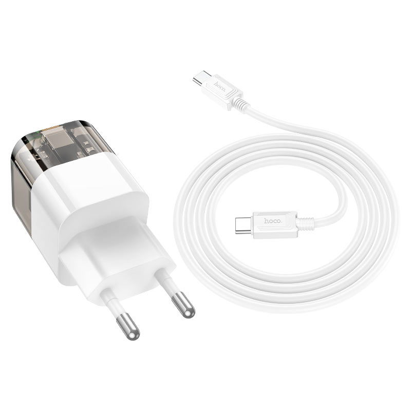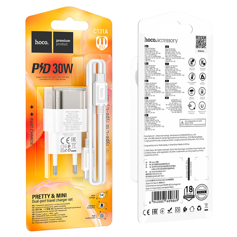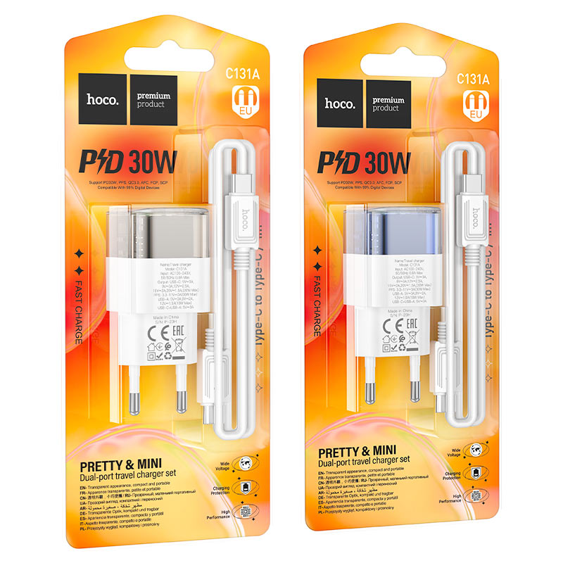 C131A Platinum, single Type-C 30W and single USB-A 18W ports wall charger, EU plug, sets with 1m cable Type-C to Lightning or Type-C to Type-C