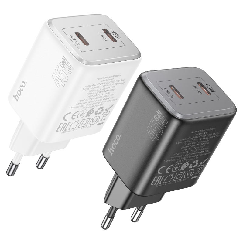 N42 Elogiado, dual Type-C 45W port wall charger, EU plug, sets with 1m cable Type-C to Lightning or Type-C to Type-C