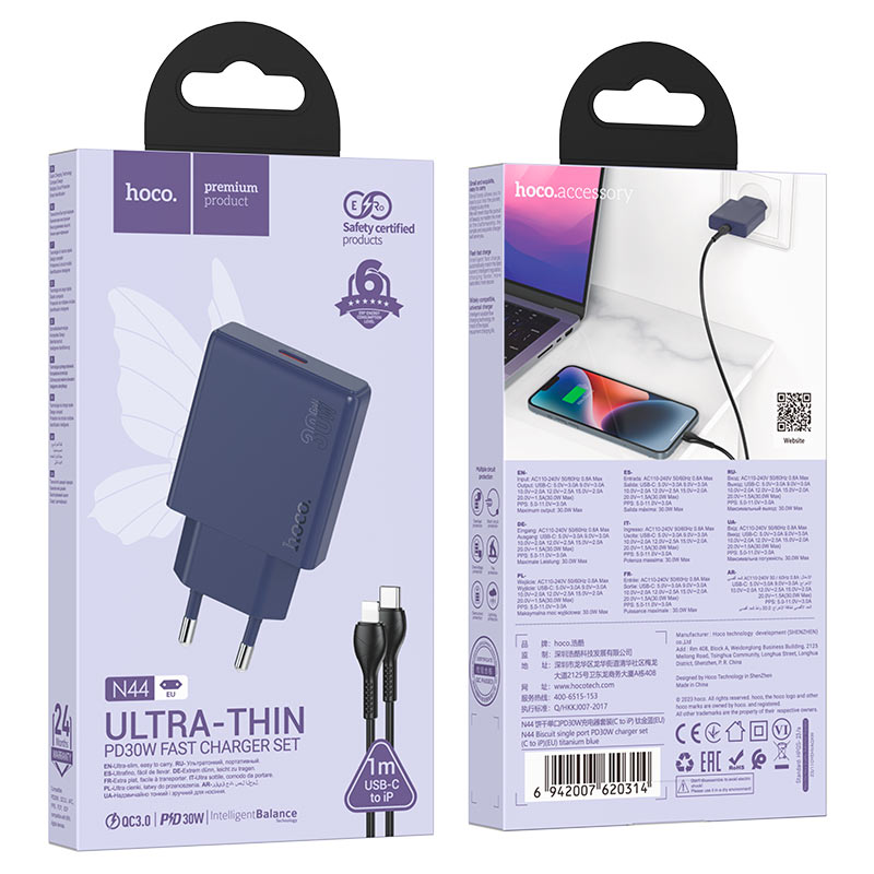 N44 , single Type-C 30W port wall charger, EU plug, sets with 1m cable Type-C to Lightning or Type-C to Type-C
