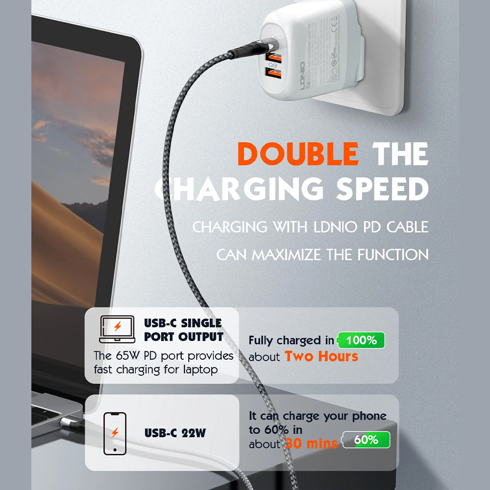 – Rapid Charging Powerhouse: The LDNIO A3511Q Fast Charging Adapter boasts an impressive 65W output, ensuring your devices charge at maximum speed. Say goodbye to waiting around for your gadgets to power up – the A3511Q gets the job done in record time.