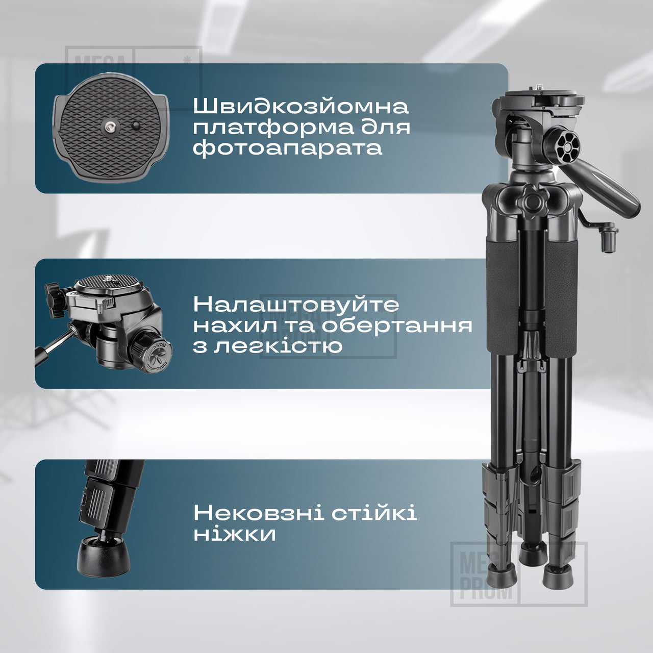175 cm maximum height Easy and stable height adjustment Professional shooting support Wide angle camera tripod Equipped with a new handle and screw foot lock design, the tripod can be quickly and easily taken down.