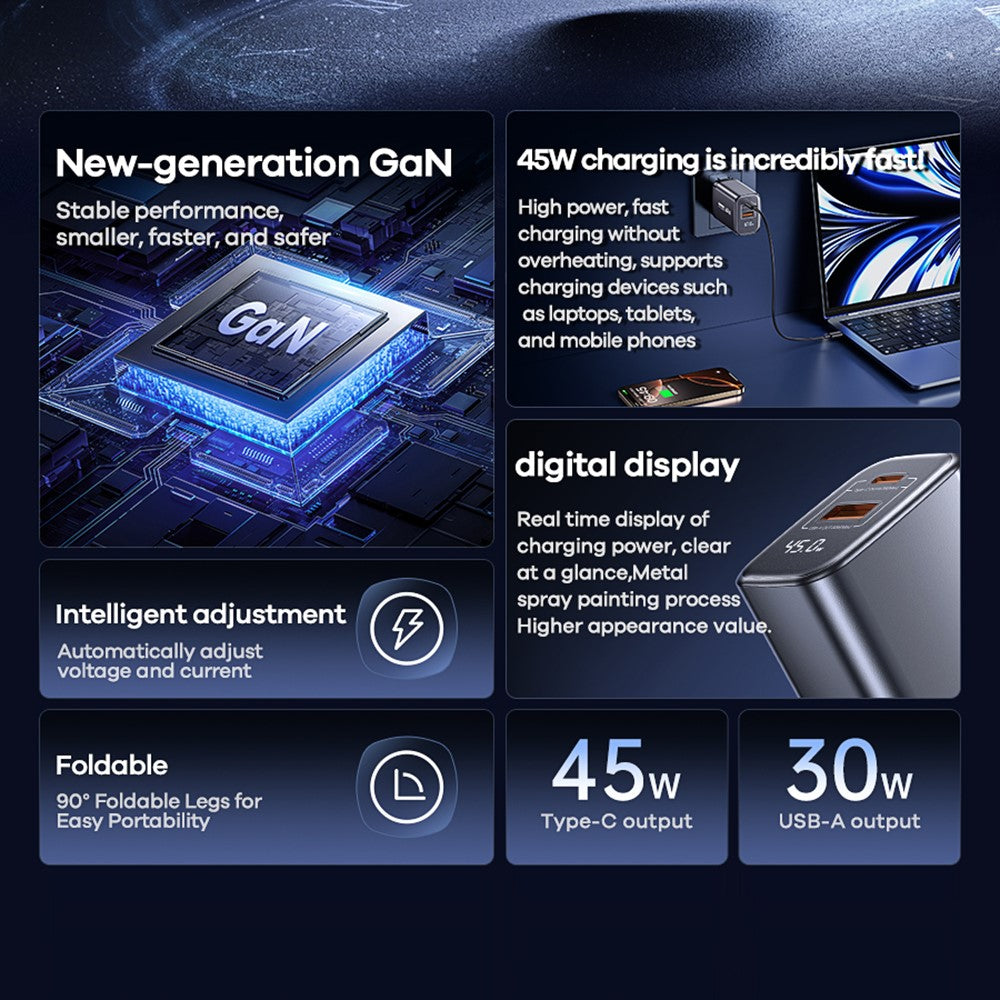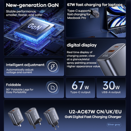 - Advanced GaN technology: Reduces heat and increases efficiency for safer and faster charging.