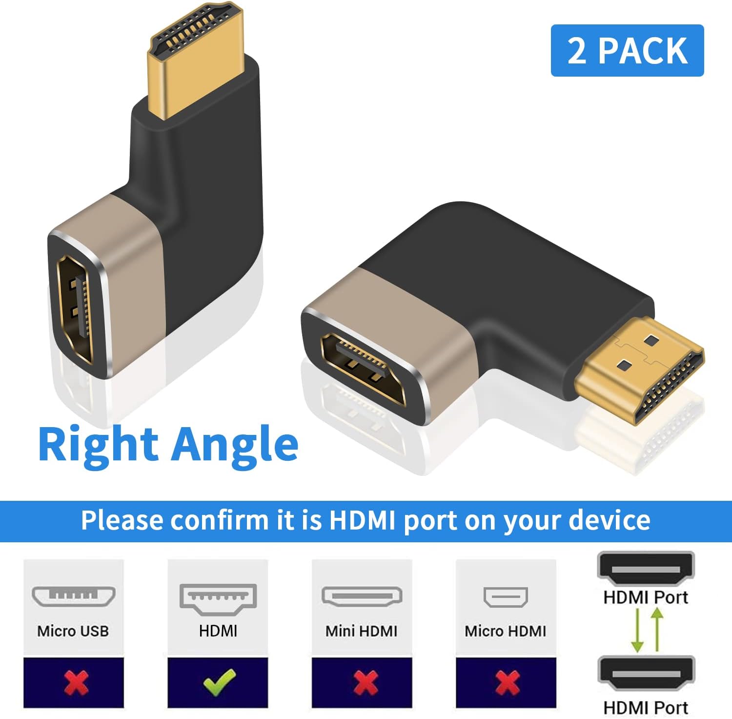 - HDMI 90 degree adapter 8K: Perfect 90 degree design, it can connect HDMI cable freely in small space or limited space behind equipment rack, without causing excessive bending of the cable and reducing the service life.