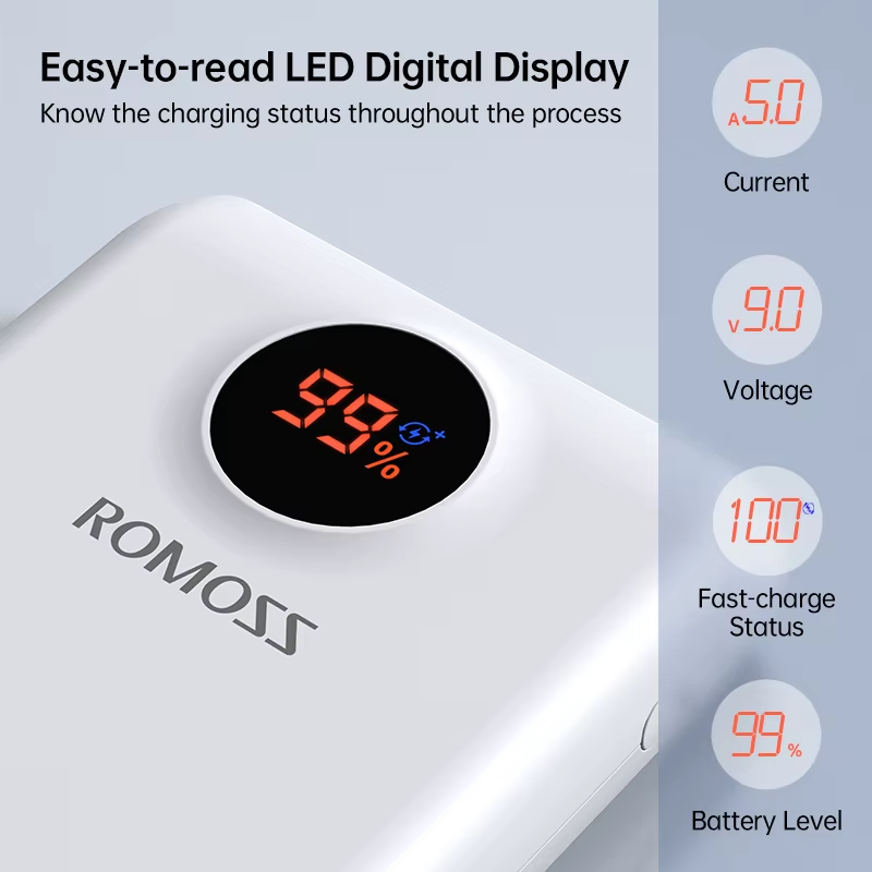 The Romoss PSW20 20000mAh 22.5W Power Bank allows you to charge up to 2 devices with ease. It features a portable design in white with an intelligent LED display that can display three different kinds of data such as current, voltage, and remaining power. This power bank's high-quality battery cells allow you to charge more devices than usual without having to recharge the power bank. The Romoss PSW20 is compatible with various mainstream fast-charging protocols making it very versatile. Thanks to its multiple inputs and dual outputs which include a Type-C connector, it also features Quick Charge compatibility with Qualcomm Quick Charge and Two-Way PD.