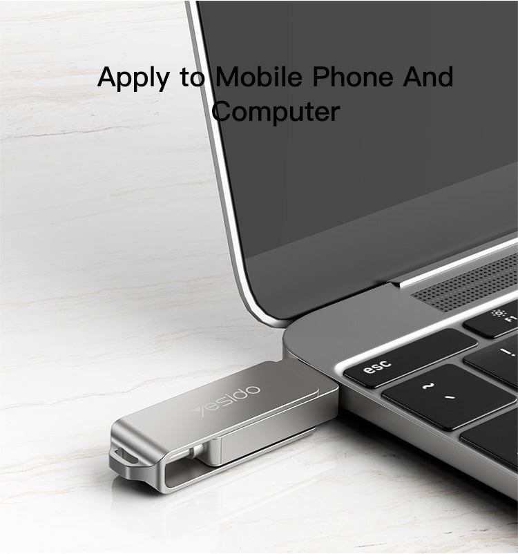 Three-in-One Interface: The Yesido FL12 stands out with its triple interface design, featuring Type-C, Lightning, and USB connectors in one compact flash drive. This allows users to connect the flash drive to a variety of devices, including smartphones, tablets, laptops, and desktop computers, without the need for additional adapters.