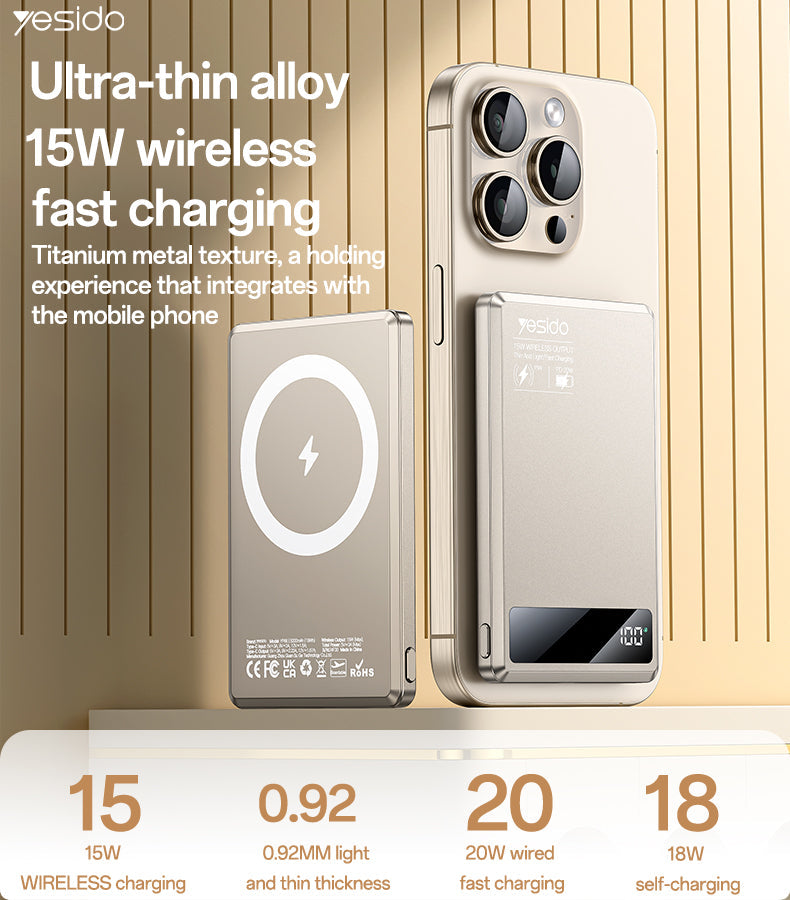 YP66 Yesido 5000mAh 15W Wireless Fast Charging Digital Display Power Aluminum Alloy Ultra-thin Magnetic Power Bank.