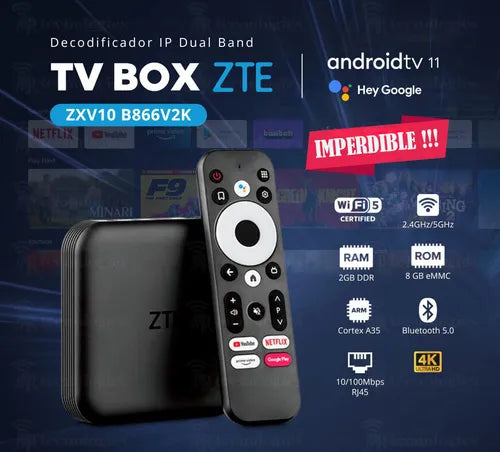 ZTE B866V2K 4K Android Certified TV Box - Quad core ARM Cortex-A35 Processor, ARM G31 MP2 GPU, 2GB Internal Memory, 8GB Internal Storage, Wi-Fi 802.11 b/g/n/ac 2x2 MU-MIMO, Bluetooth, 1x Ethernet RJ45 Port, 1x HDMI 2.1 Output Port, 1x USB 2.0 Type A host port, AV output CVBS and L/R audio, Dolby HD Audio, Android TV Operating System, Retail Box , 1 year Limited Warranty